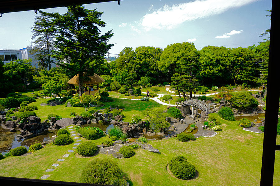 広大な回遊式庭園は、緑が豊かで、アーチ状石橋やあずま屋があり贅を尽くしてあります。