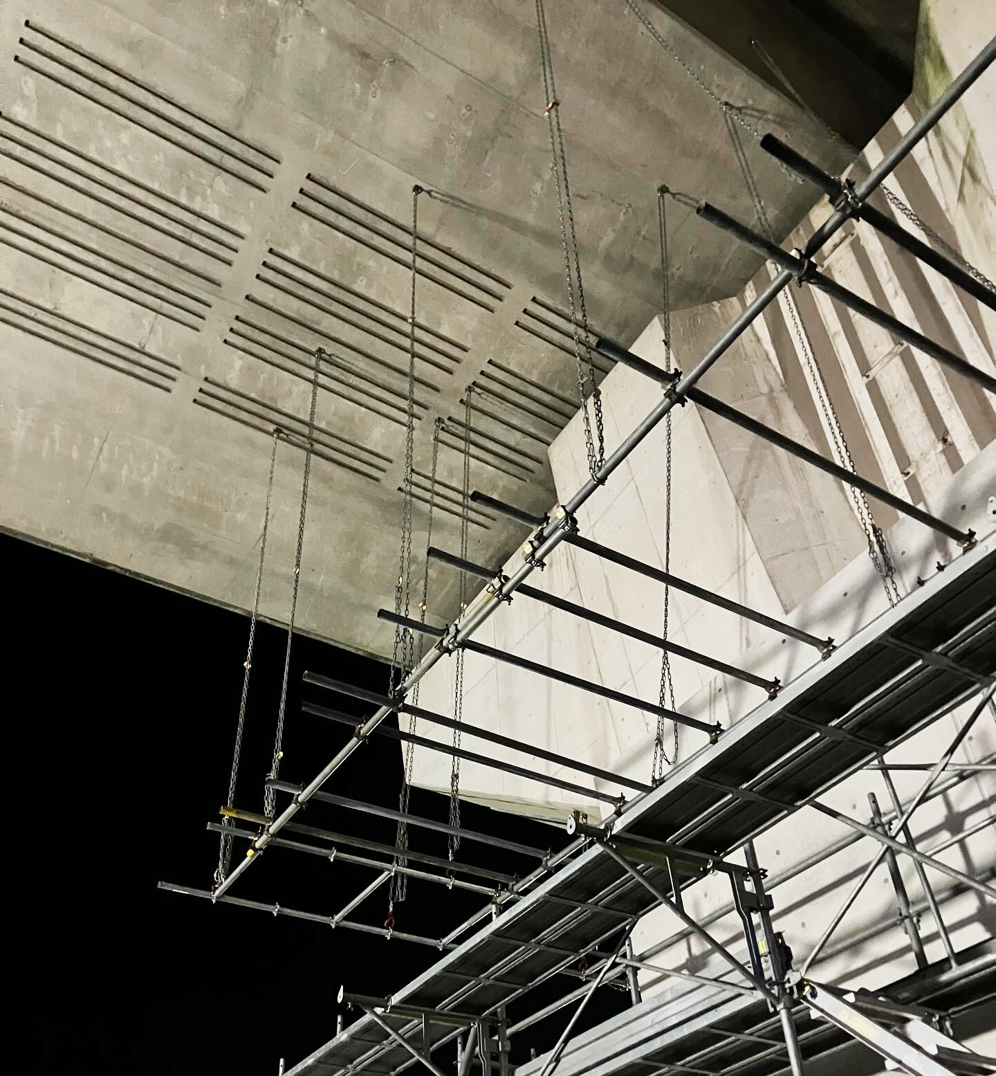 福岡市西区の高速道路高架下では、インフラに伴う重要な補修工事が夜を徹して行われています。